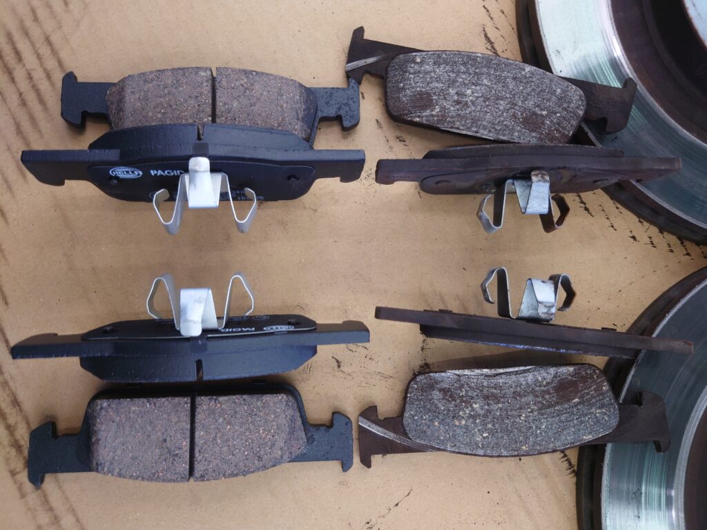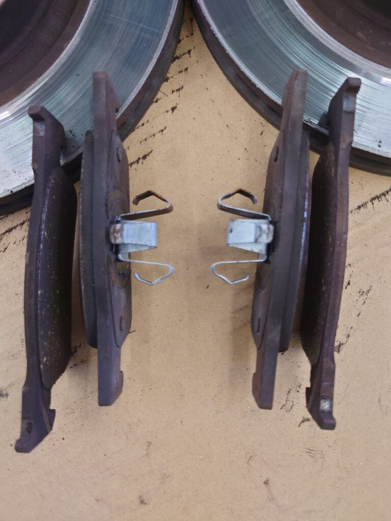 ブレーキパッドの新旧比較ですが、古い方はパッド部分が無くなり鉄板のところまであたってます。